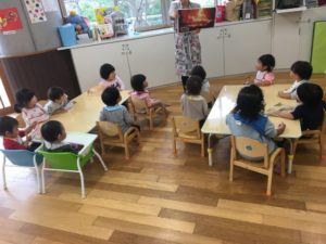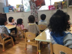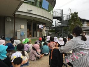 「火事だー‼️」と声が聞こえるといつもとは違う雰囲気に気づきあたりをキョロキョロするつき組の子ども達…