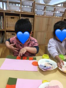 真剣に両手をうまく使いながら貼っていきます。完成した制作がこちら!!!