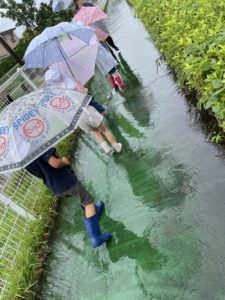 傘にあたる雨の音を聞きなから、ミミズ・バッタ・ダンゴムシなどを見つけたりして、いつもとは違う雨の日のおさんぽを楽しんでました。