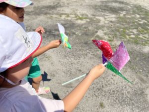 自分達で色を塗ってオリジナルかざぐるまを作ったので、それを持って出かけました!