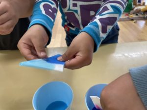 紙を三角や四角に折ってから、色水の中にチャプン!