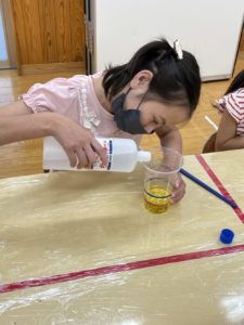 水と洗濯のりを自分で注ぎながら