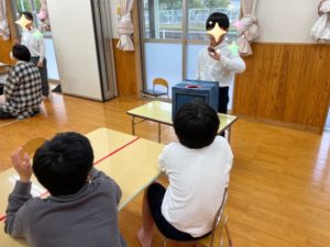 中身の見えない箱に興味津々な子ども達😦