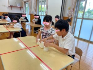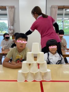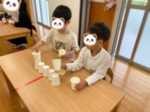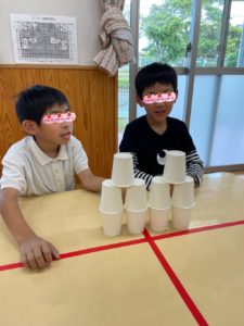 今日の活動は紙コップタワー