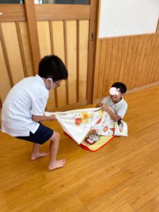 タオルを使ってソリ遊び♪