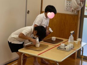 台を拭いて、お茶を注いで友達や保護者の方に運んでもらいました🍵