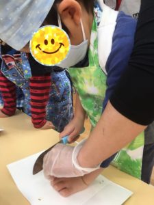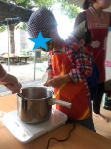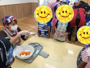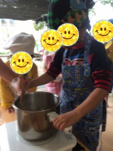 その後お野菜を一人づつ入れてお友達交代でかき混ぜていきます。