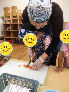 その後、各グループ(今回は来年度の小学校行く予定が同じ場所のグループ分けでした)に分かれて、道具の使い方を再度聞き、野菜を切っていきます。始めは難しそうでしたが、回を重ねるごとにできるようになっていました。
