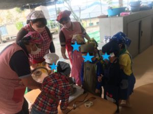 待ちに待ったカレークッキンングです。三角巾とエプロンとマスクを身に付けて開始です