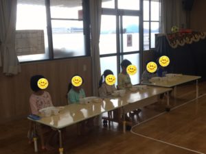 たくさん体を動かした後は、お腹ぺこぺこです。大きな輪になりみんなでたべました。