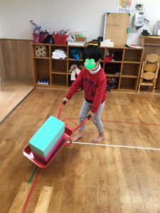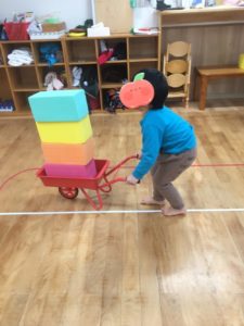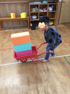 始めは、先生が決めた数のブロックを乗せて運びます。