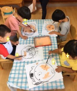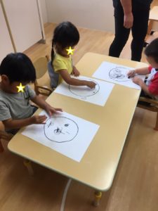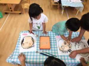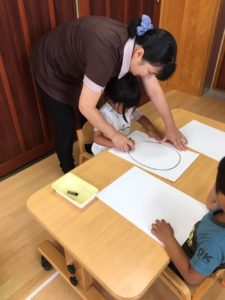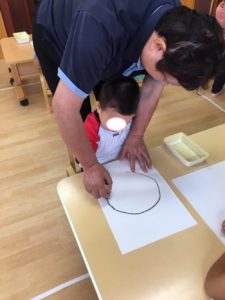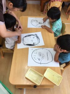 顔の輪郭を先生と一緒に描き、