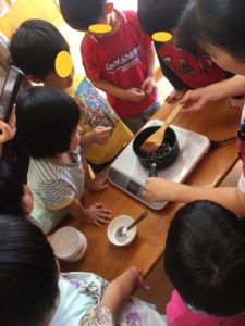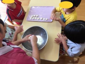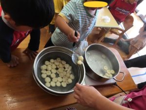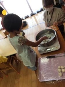 形を作ったら、お湯で湯がいていきます。熱湯なので、鍋に入れる時は、特に真剣にしていました👏