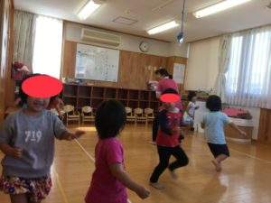 金曜日ぱんだ組のリトミックは、シフォン布を使って体を動かしました(^^)舞い上げて キャッチ😀朝から大喜びのお友達😂