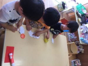 ノリを塗って、、、あっ、きりん組の常連のお友達も参加して、お手伝い😆