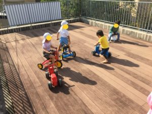 二階のデッキで乗り物に乗ったり