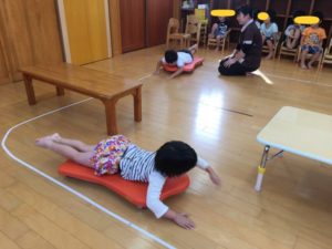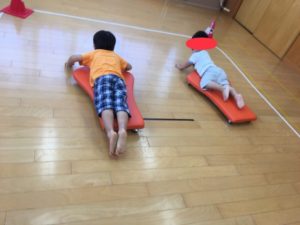 腹這い姿勢でスケーターに乗り、腕を使って