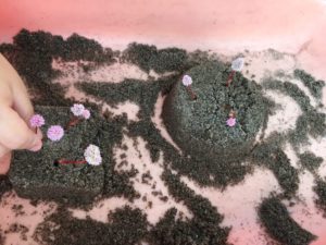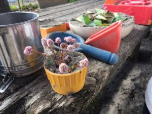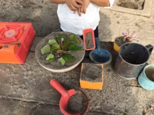 カップやお皿に砂を入れて、葉っぱ☘や花🌸をあつめて、、、