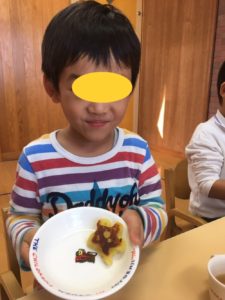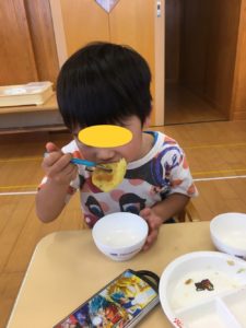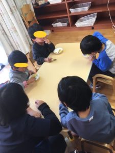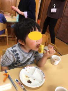 1日登園のお友達は、制作活動が終わった後に、みんなで「いただきまーす」😋