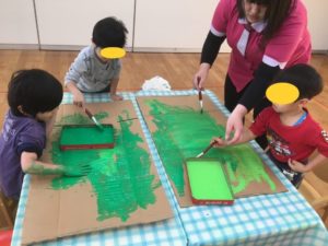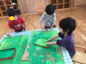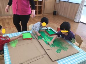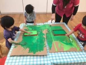 ダンボールに、緑や黄緑色の絵の具を塗っていく作業です🖋