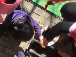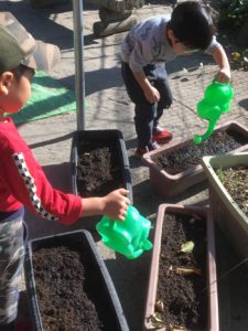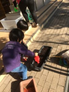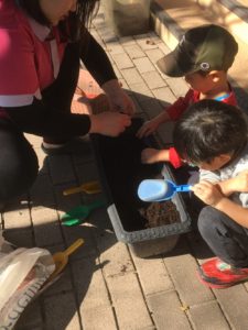スコップでお友達と交代しながら、何度も何度も土を入れ、ようやくプランターの準備ができました😆