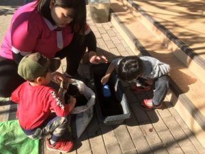 スコップでお友達と交代しながら、何度も何度も土を入れ、ようやくプランターの準備ができました😆