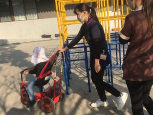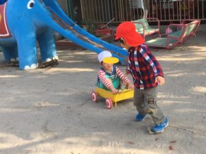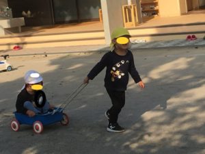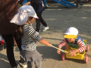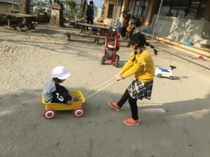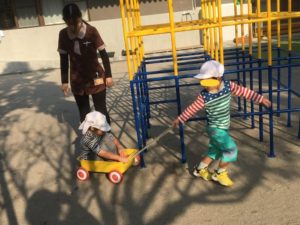 台車にお友達が乗り、交代で引っ張って動かすお友達😃
