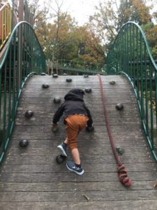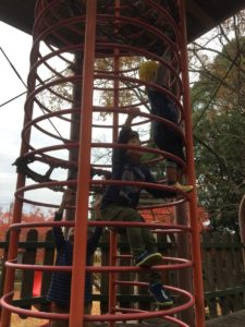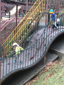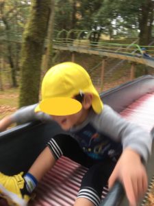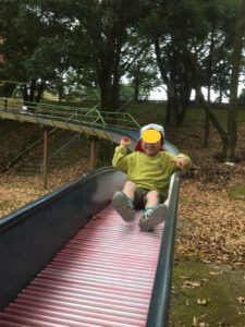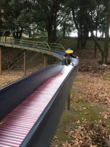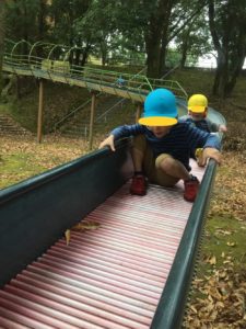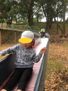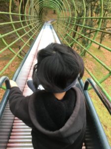 肌寒さもふき飛ばすごとく、公園の遊具にまっしぐら😄人気のローラー滑り台に一番乗りです😄