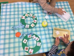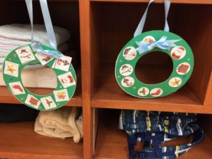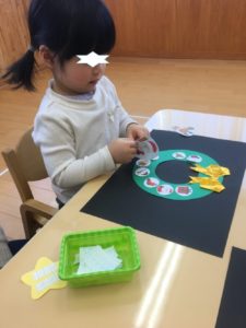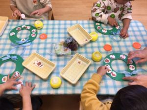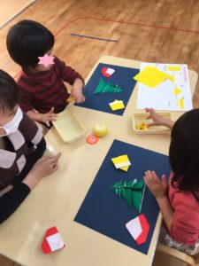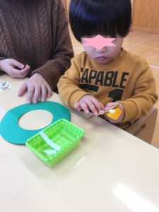 くま組は、リース作り❣️模様を一枚ずつ、のりづけして貼っていきました❣️