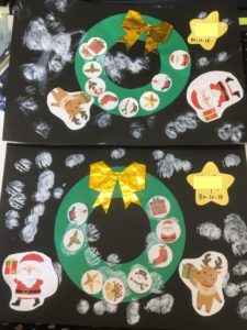 最後は、タンポを使って絵の具をつけると、雪化粧の中のリースが出来上がりました😍クリスマスが待ち遠しくなってきているお友達です(((o(*゚▽゚*)o)))♡