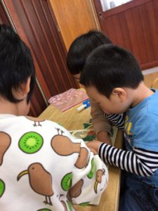 そーっとのぞくと、、パズルです🧩30ピースのパズルをお友達と協力して頑張っていました😄