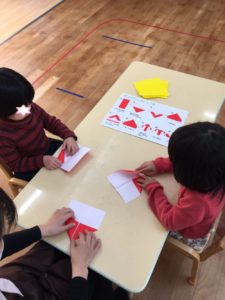 まずは、らいおん組❣️折り順を見ながら、折り紙でツリー🌲のパーツを折って、