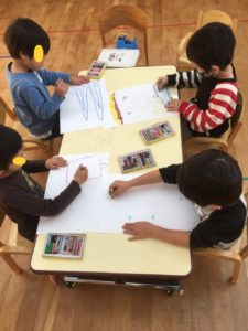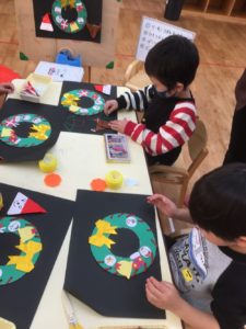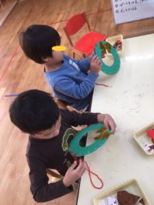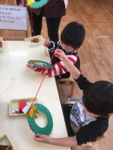 17日午前のらいおん組は、リースのひも通しを苦戦しながらも、頑張っていました💪