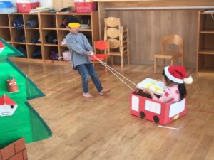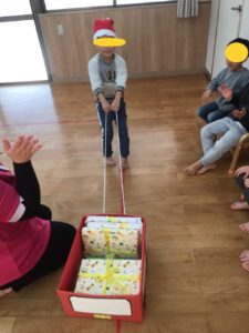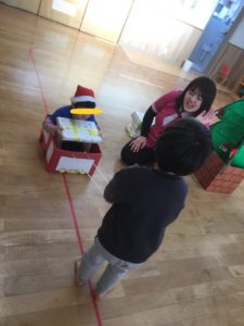 今週は運動あそび週間ということで、主活は、箱はこび🎁まずはサンタさんになったお友達が、プレゼントが入っている箱を運びます(^^)両足踏ん張りながら、引っ張っていきました😄