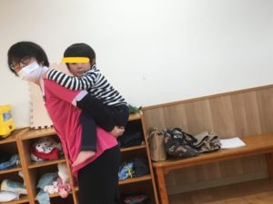 ④ぜんぜがのんの ♪ぜんぜんのーぶたこはいらんかぶたこをかわんか?♪ で、みどり先生の背中に背負ってもらったお友達、ゆらゆら動きます😃