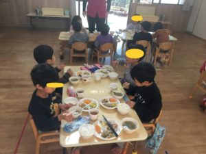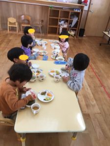 総勢14にんのお友達は、にぎやかに楽しく給食を食べました😃