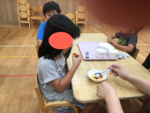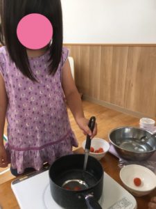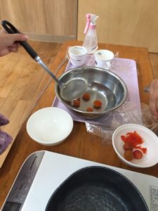 👇ここでは、園庭で採れたトマト🍅を使い、何やら作り始めていました(^^)