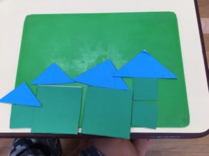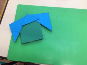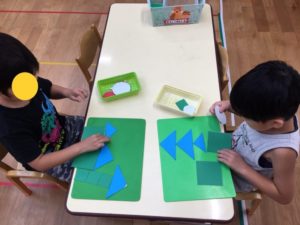 木曜日午後のりす組のお友達、自由あそびの時間に、⭕️ △ 🔲 のパズルを使って何か作り始めていました(^^)