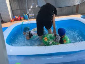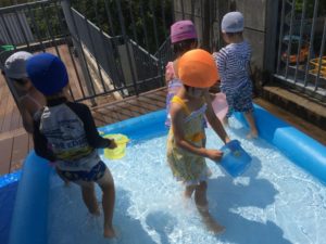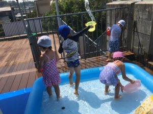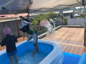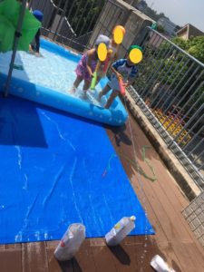 金曜ぱんだ組は、二階のデッキで水あそび😊