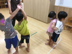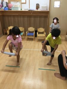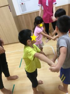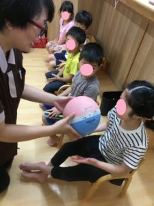 ボールを、先生からお友達、お友達同士に