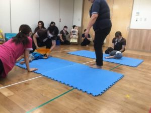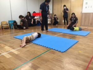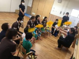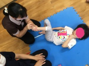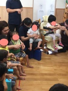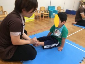 また、先生の膝に乗り、🎵バースにのーって揺られて〜🎶と、振動や動きを楽しみました😄先生達は、子供の状態に合わせた関わりができるよう頑張ります✊