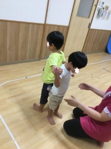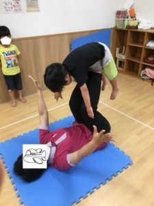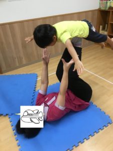 15日火曜日きりんの教室の自由あそびで、バランス飛行機をしてみました😃 バランスをとり平衡感覚を養う体操です🤸♂️ 両腕を握ったまま先生がゆっくりと足を上げていき、こどものバランスが保たれてきたら