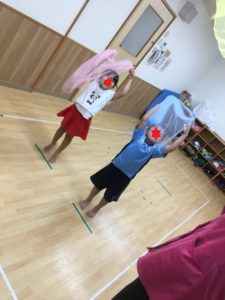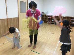 🎵上から下からおおかぜこーい🎵に合わせて、シフォン布を上下に揺らし、