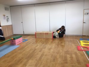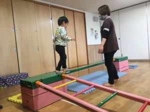 専門職の先生から、自由遊びから1日の活動の様子をひと通り見てもらっています。気になることなど職員も質問したりなど、個別に見てもらうこともあります。今日は、りすグループのお友達の活動を中心に見てもらっていました。活動は、サーキットで、体の使い方を見てもらっています。