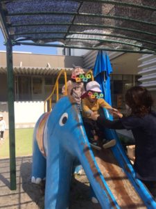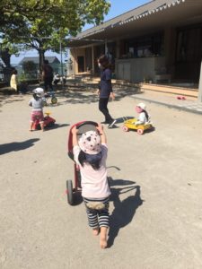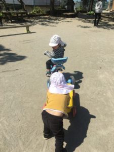 今日のくまグループとごりらグループは、園庭に出て遊びました。