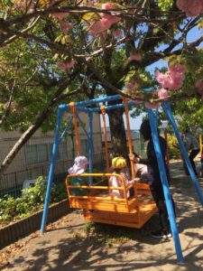 新緑の葉っぱや八重桜の木の下ゆりかごブランコは、いい木陰になり、いい休憩場所になっています。