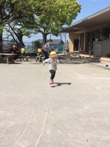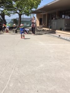 この日、キリン組さんのリトミック活動の一部はお外で活動でした。