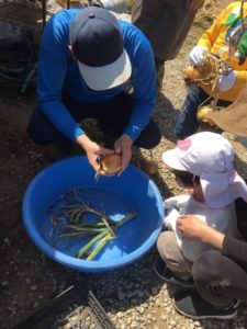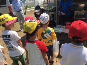 行き先は大潟屋で野菜を作っている畑でした。今が旬の新玉ねぎの収穫です。大潟屋の先生が新玉ねぎについてお話してくれました。みんな真剣です。