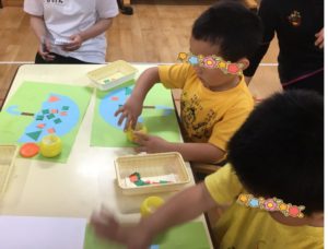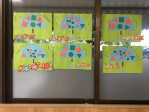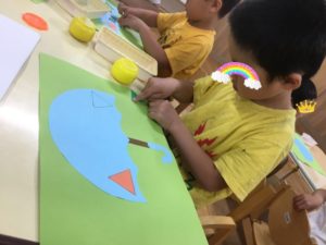 りす組の製作は傘と雨でした。年中さん年少さんで、同じ傘と雨でしたが、年中さんは、ハサミで、三角や四角を切り、年少さんは、三角や四角に切ってある紙を合わせて、傘に張り付けていきましました。