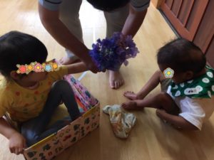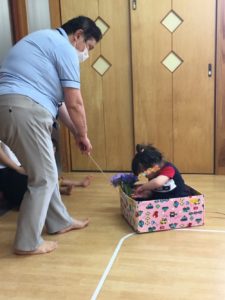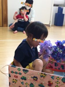 そのあと「アジサイつもうか〜」の歌に合わせて箱車に乗って、室内を回りました。